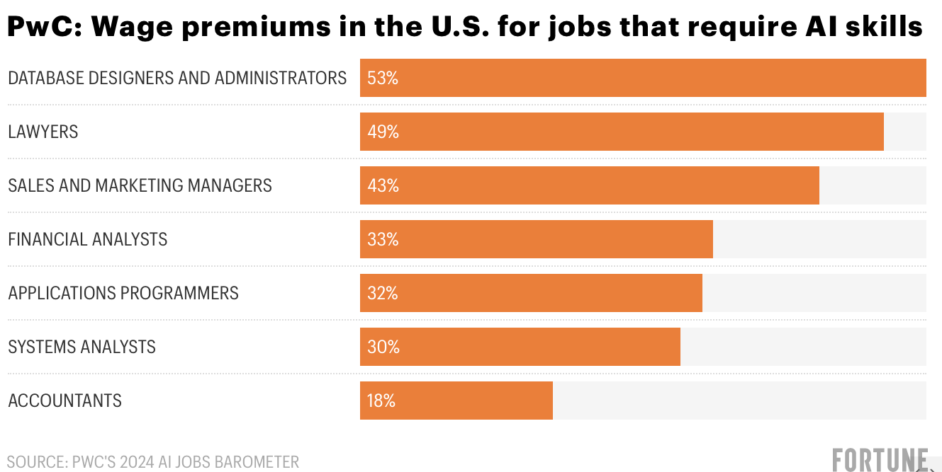 In the U.S., these jobs carry an average wage premium of up to 25%, PwC noted. In just one example, a look at job ads for sales and marketing managers in the U.S. who need AI expertise shows wages that, on average, are 43% higher than similar jobs without AI skills. In another example, financial analysts could receive a premium of about 33%.