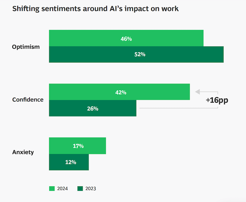 Boston Consulting Group's (BCG) AI at Work 2024 report is based on a global survey of more than 13,000 frontline employees, managers, and leaders. Overall, confidence in GenAI has grown since 2023 (up 16 percentage points to 42%). Leaders have the most confidence (50%) compared to frontline employees (33%). In terms of location, confidence in GenAI is higher in the Global South (e.g., 54% in India) compared to the Global North (e.g., 34% in the U.S.), according to the report. However, overall, optimism about GenAI is slightly down by 6% since 2023.