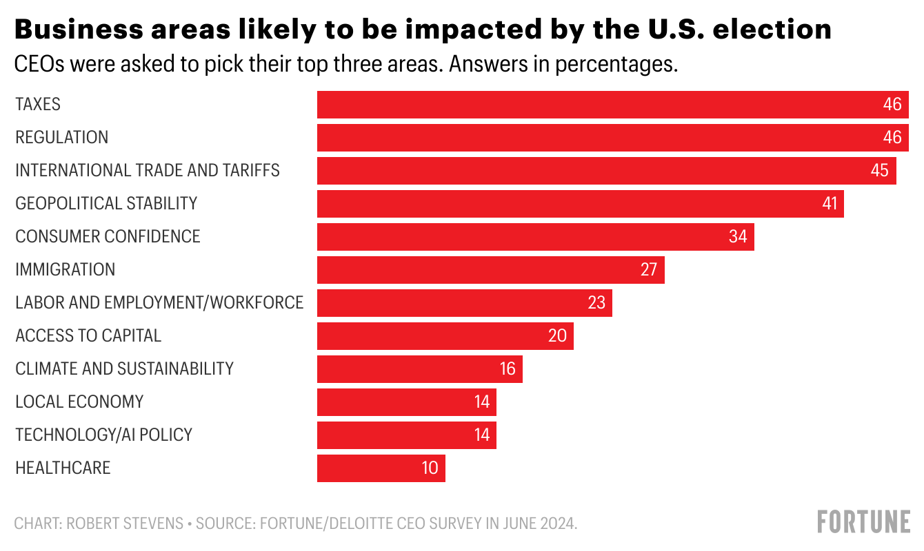When asked specifically about what area of their business would be most affected by the outcome of the election, the top two responses were taxes and regulation with 46% each. Immediately following with 45% came international trade and import tariffs.