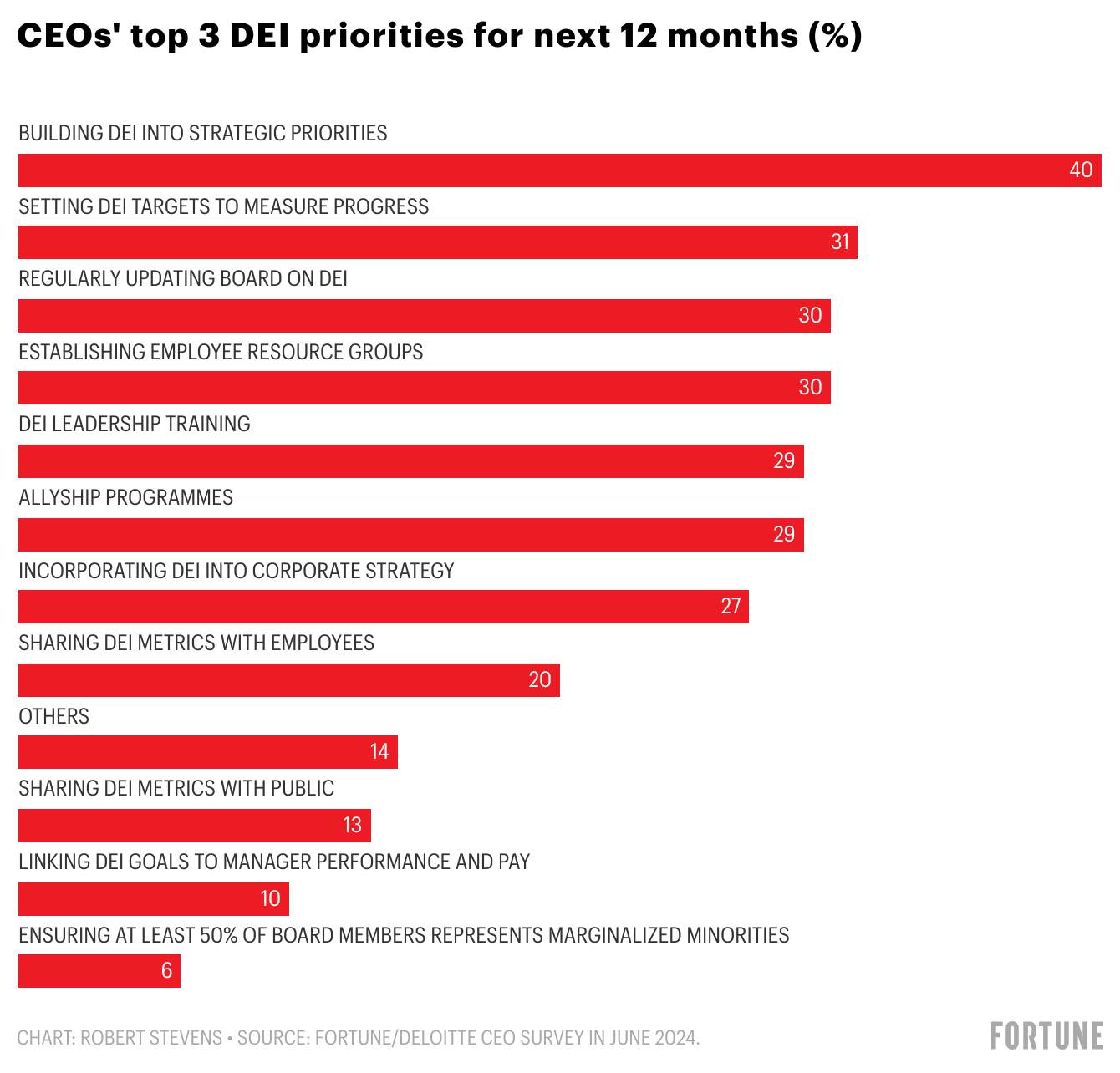 When it came to the top barriers CEOs face when advancing DEI efforts, only 14% identified public backlash while just 5% blamed a lack of buy-in across their organizations. Instead, the two most often cited responses were competing priorities (33%) as well as talent acquisition/retention and employee engagement (30%).