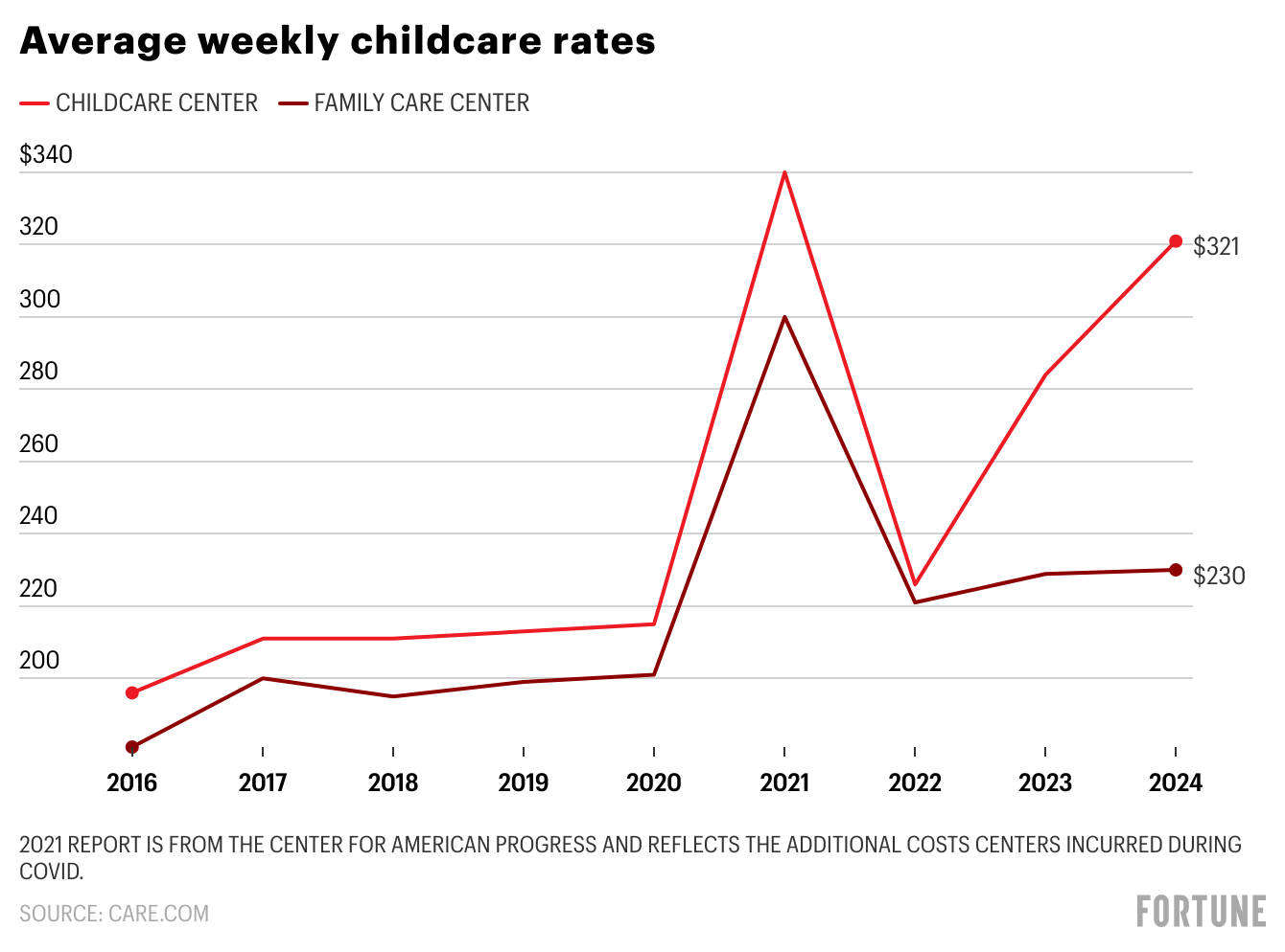 Childcare prices are already prohibitive for many parents. The U.S. Department of Health and Human Services recommends that families spend no more than 7% of their income on childcare. Yet according to Care.com, an online childcare marketplace, average costs are currently running at 27% of income, and still rising. According to data from the Bank of America Institute, the bank’s internal think tank, average childcare costs are now 32% higher than in 2019, driven up by a range of inflationary factors, including rent, insurance, and energy.