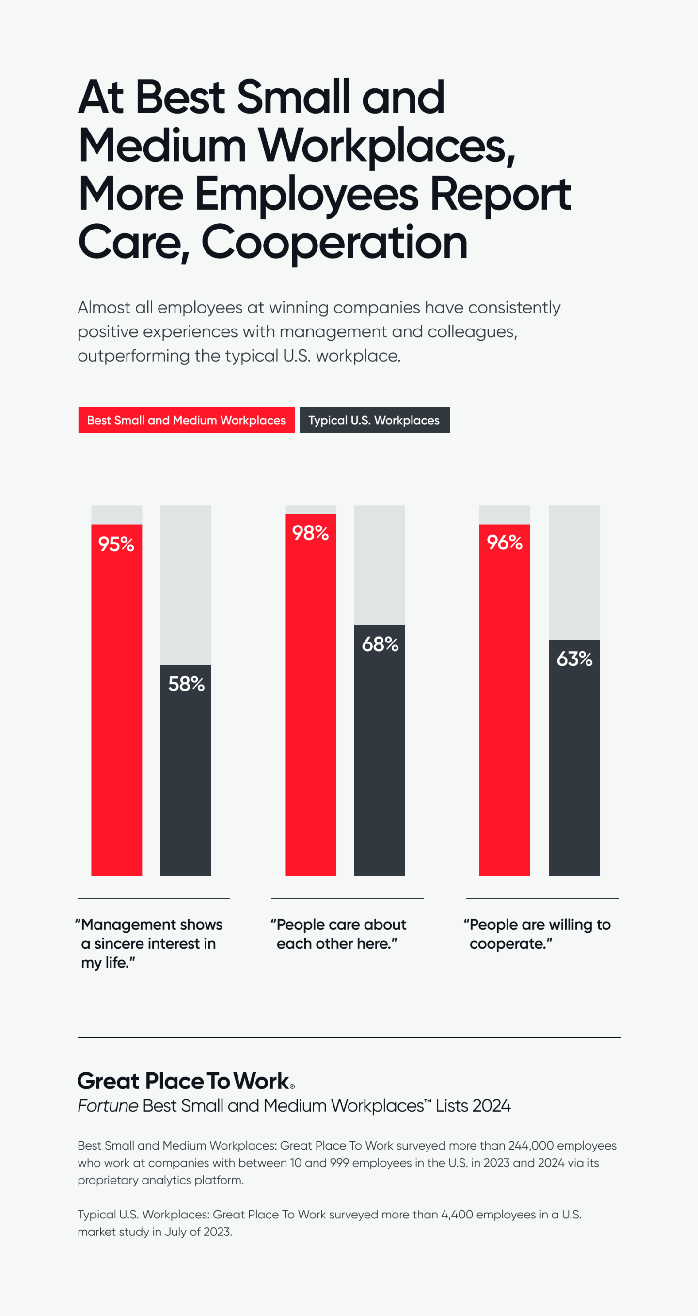 At the Best Small and Medium Workplaces, more than nine in 10 employees report that management shows a sincere interest in their lives (95%), and that employees care about each other in their workplace (98%). In a Great Place To Work market survey of 4,400 U.S. employees at a typical workplace, only 58% said management shows interest in their lives. A little over two-thirds (68%) said employees cared about each other at their workplace.