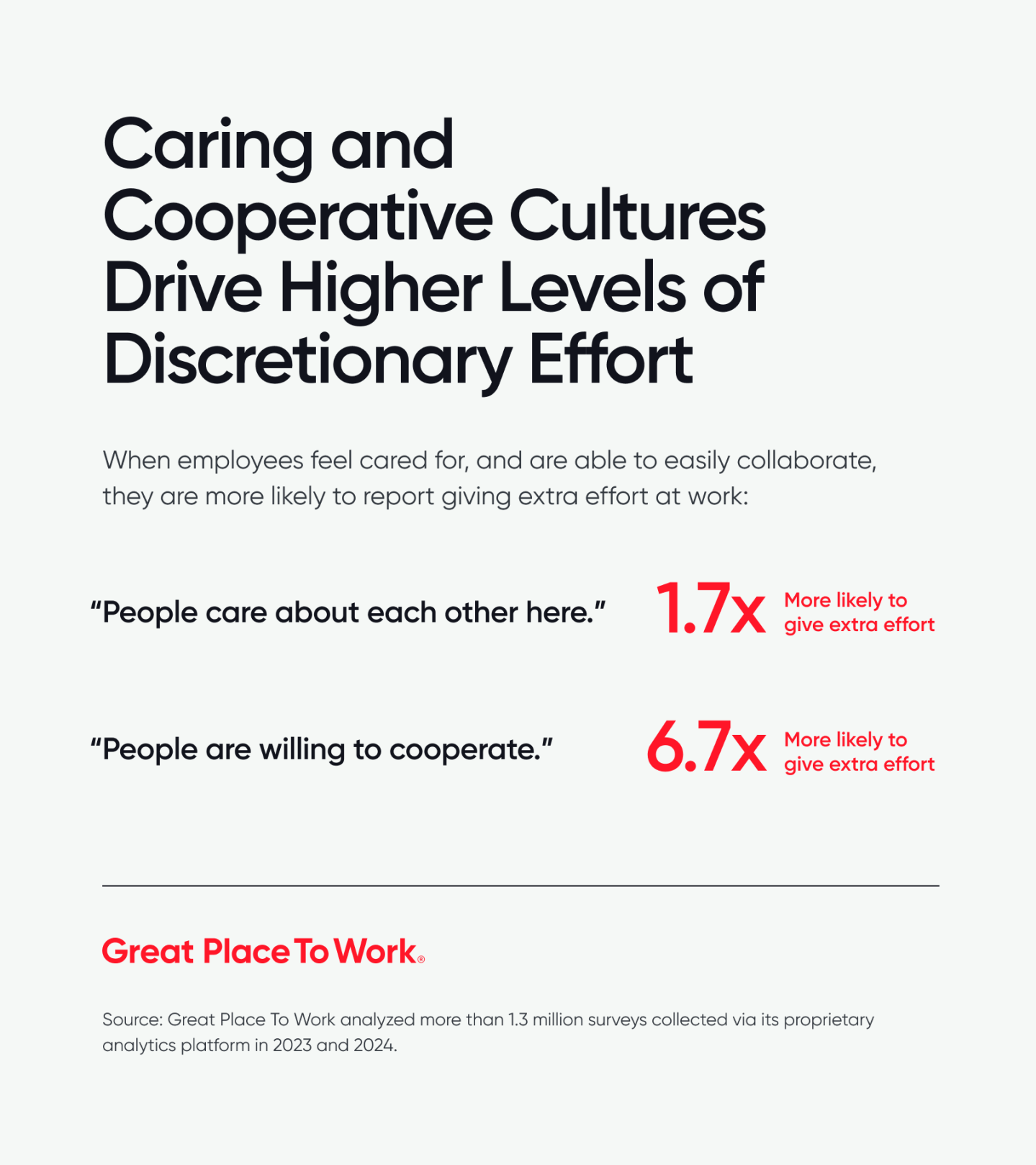 For companies looking to increase productivity and improve performance, a culture of cooperation is key. When employees say people are willing to cooperate, they are a whopping 6.7 times more likely to give extra effort at work, according to survey data analyzed by Great Place To Work.