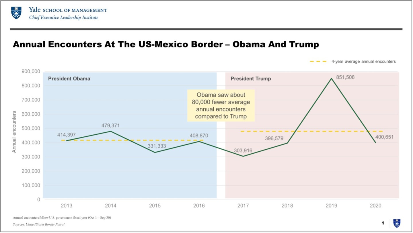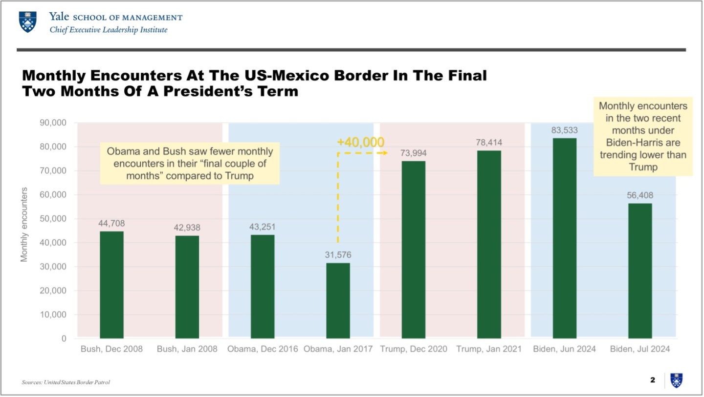 Annual encounters at the U.S.-Mexico border under President Trump averaged 488,164. Under his predecessor, President Barack Obama, annual encounters averaged 408,493, more than 16% lower. Even in those “final couple of months” of Trump’s presidency, Obama had lower numbers with 43,251 in December 2016 and 31,576 in January 2017, compared to 73,994 and 78,414 for Trump. Currently, President Biden can also claim to be beating Trump with the latest figures from July 2024 at 56,408. Encounters have steadily declined after Biden-Harris took executive action to secure the border, only after Trump acolytes in Congress blocked the passage of a bipartisan border bill at the former President’s request.