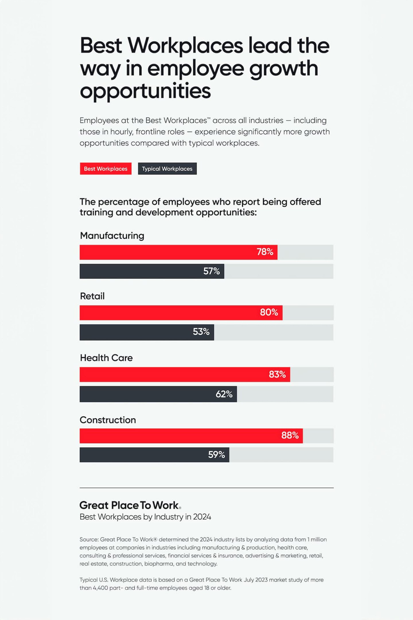 You might be surprised to hear that the Fortune Best Workplaces in Construction offer more opportunities for career growth than typical workplaces in any industry. At companies on the construction list, nearly 90% of employees feel they have professional development opportunities—among the highest at the Best Workplaces in any industry.
