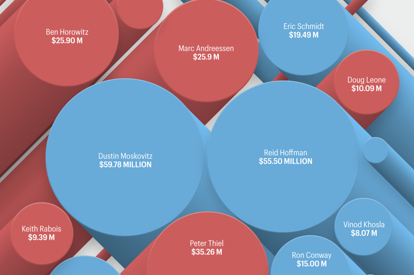 For a fuller picture of Big Tech’s political giving, we’ve gathered dozens of big names in Silicon Valley and where they’re putting their millions in the chart below. Hoffman and Moskovitz have the biggest presence, giving more than $55 million each to Democrats over the past four years. They’re followed by a handful of conservative VCs: Thiel, Andreessen, and Horowitz.
