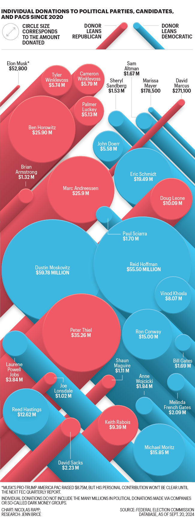 The charts below visualize the political donations of Silicon Valley’s most prominent figures to political parties, candidates, and PACs this election cycle, color-coded according to whether their overall giving leans Republican (red) or Democratic (blue). The circle sizes correspond to the amounts donated. They are based on FEC data as of Sept. 20, 2024, and they only include individual donations. (Individual donations do not include political donations made via companies, nonprofits, or so-called dark money groups, which can be substantial, as recent reporting from the Wall Street Journal on the political donations of Elon Musk shows.)
