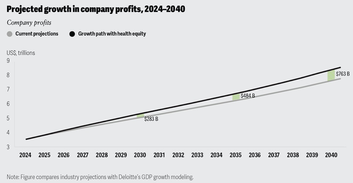 The estimates show that reducing health inequities could create significant economic value, including a gain in GDP and benefits for businesses. By 2040, the potential gains in GDP could reach $2.8 trillion, including $763 billion for corporate profits, the research finds. Also, reducing health gaps could prevent 5 million people from leaving the workforce due to severe disability or premature death.