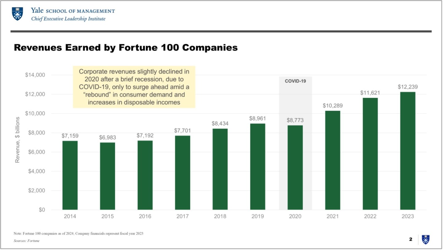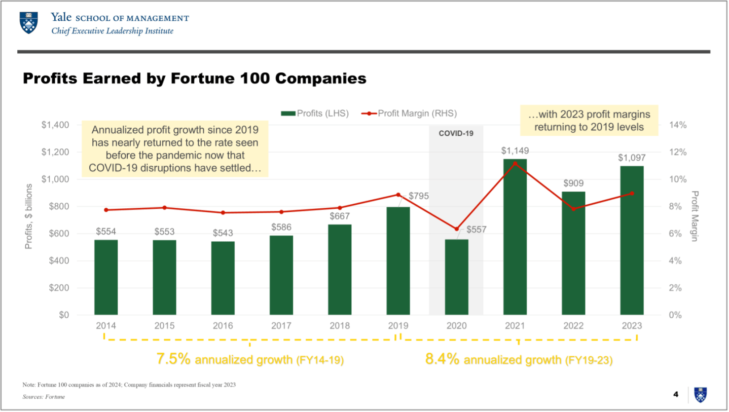 Our proprietary analysis of the most recent fiscal year (2023) revenues and profits of Fortune 100 companies finds little to no evidence of corporate price gouging or profiteering. To the contrary, our analysis finds that the largest corporations are responding to consumer demands by containing price increases and introducing value products and discount programs. Their actions are reflected in the latest inflation rate, which is now trending below the Federal Reserve’s target rate of 2% on a three- and six-month basis.
