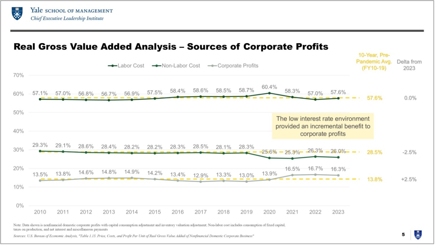 A review of profit margins further confirms that the Fortune 100 acted prudently and methodically as they managed price increases. Margins widely fluctuated in the two years after the pandemic but eventually settled at 2019 levels (9.0%) in 2023. Moreover, real gross value-added data from the U.S. Bureau of Economic Analysis reveals that profit margins were only able to match the historical average due to the low interest rate environment and did not come at the expense of labor, as some progressives charge.