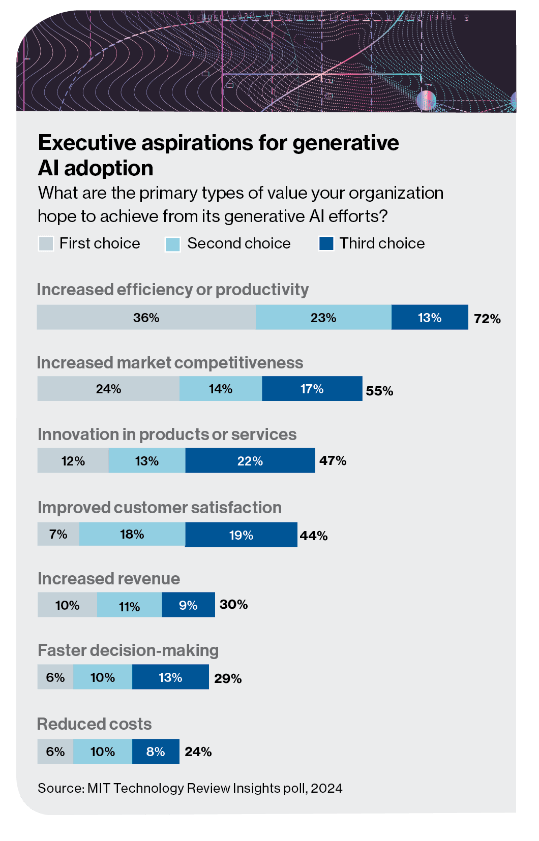 Increased efficiency is a top genAI aspiration. Executives surveyed by MIT Technology Review Insights, along with business technology provider Snowflake, found that 72% were prioritizing increased efficiency and productivity from their generative AI efforts, far exceeding their hope for increased revenue (30%) or reducing costs (24%). Increased market competitiveness ranked second at 55% in the survey, and product and services innovations and improved customer satisfaction were also seen as more valuable than boosting the top line or trimming expenses.