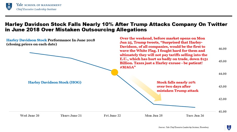 More often, Trump only succeeded in temporarily tanking the stock prices of companies he targeted without actually shifting any factories or jobs back to the U.S., such as when the stock of Harley-Davidson dropped nearly 10% over two days in June 2018 after Trump abruptly tweeted threats to increase taxes on the company for supposedly outsourcing (which was later shown to be untrue).