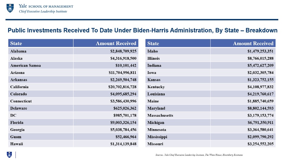 The results from this public-private capital partnership are seen not only in top-line macroeconomic indicators but felt in local communities all across the country, with every single state receiving at least hundreds of millions, in some cases billions, in public investments, across red, blue, and swing states, as funds are not allocated based on political patronage or favoritism and not clustered around the two coasts.