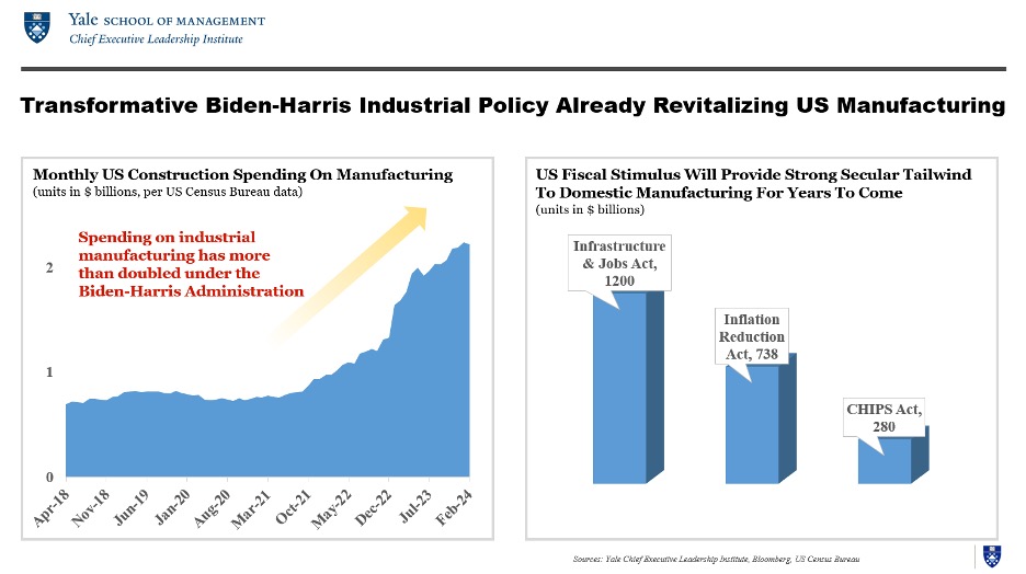 In stark contrast to Trump’s idiosyncratic approach of browbeating companies into building factories and returning jobs to the U.S., the Biden-Harris administration has taken a far more comprehensive and systematic approach, crafting carefully targeted industrial policies aimed at investing in both large-scale national missions (like combating climate change) and investing in highly strategic sectors (like semiconductors). That approach focuses on tackling everything from energy security, research and development, technology, and infrastructure by incentivizing private sector co-investment through subsidies and tax credits.