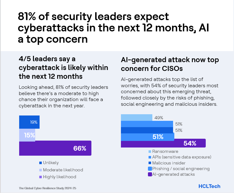 81% of security leaders expect to face a cyberattack in the next year. A survey conducted by IT consulting company HCLTech found that eight of 10 security leaders believe there’s a “moderate to high” chance their organization will face a cyberattack in the next year. AI-generated attacks were the top concern for chief information security officers, followed closely by risks of phishing, a malicious insider, and API vulnerabilities, which involve the rules that let software applications share data but could also result in harmful exposure.