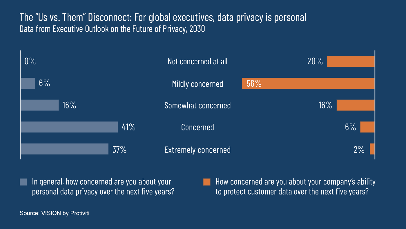 Executives worry about their personal data privacy but overwhelmingly say their company is doing a great job. A survey published this week by consulting firm Protiviti and the University of Oxford found that only 8% of global executives say they were “concerned” or “extremely concerned” about their company’s ability to protect customer data over the next five years, but paradoxically, 78% of those respondents say they are worried about their own personal data privacy over the next five years.