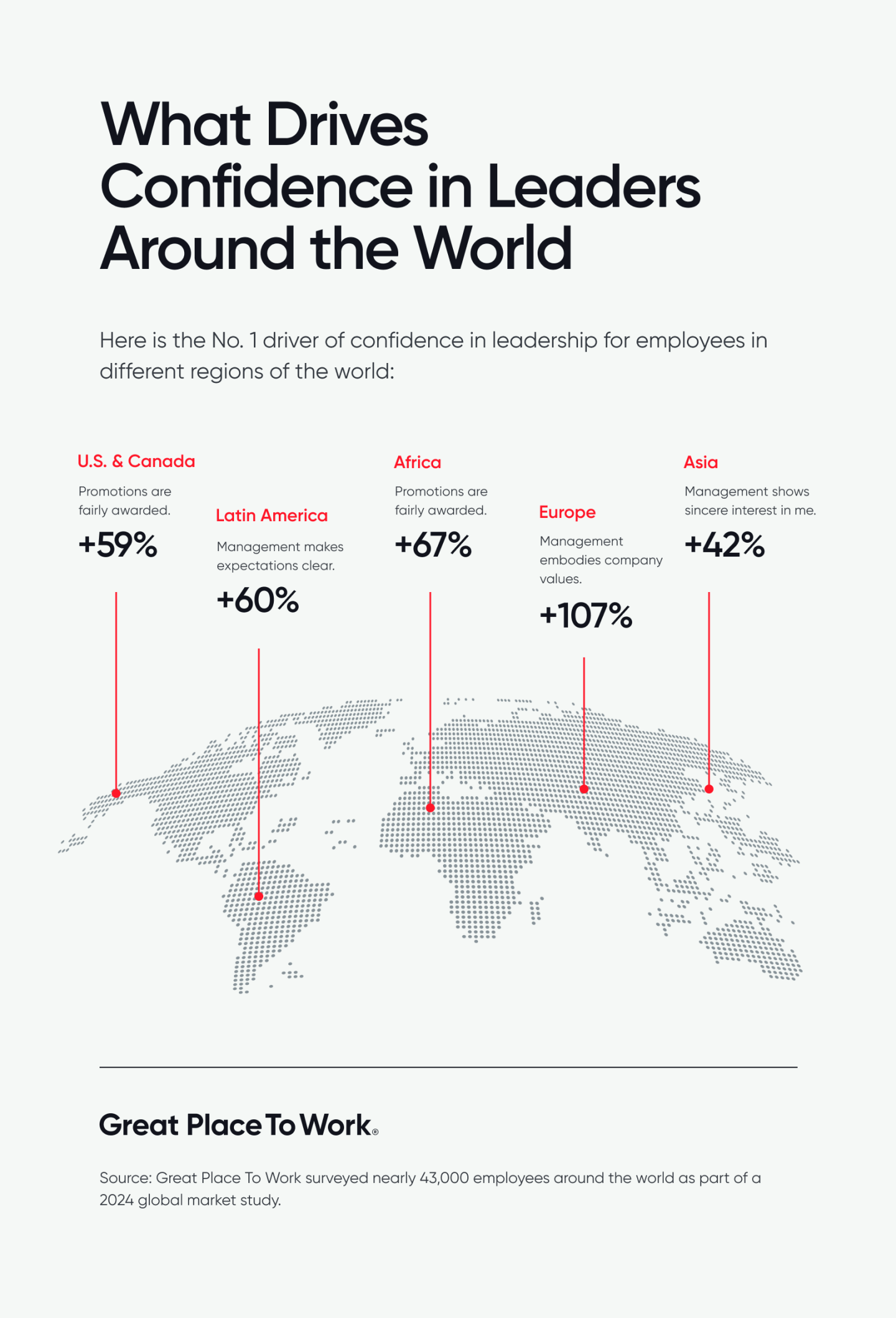In Europe, having ethical managers that lived up to core company values made employees 107% more likely to have confidence in their leaders. In Latin America, clear expectations from management made employees 60% more likely to have confidence. In the U.S. and Canada, fair promotions practices made employees 59% more likely to have confidence in leaders. Fair promotions also made employees in Africa 67% more likely to have confidence in leaders.