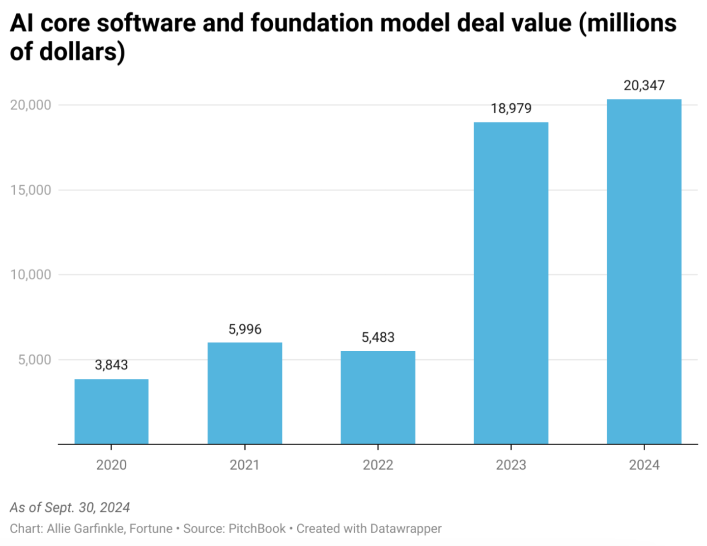 I honestly may have expected this number to take a dive in 2024, but it’s up and seemingly growing (we’ll know where it lands, as with all these numbers, in the full-year report). Broadly, part of what’s going on is that, actually, lots of AI companies have begun to prove their long-term worth, particularly when it comes to enterprise applications, said PitchBook senior emerging technology analyst Brendan Burke.