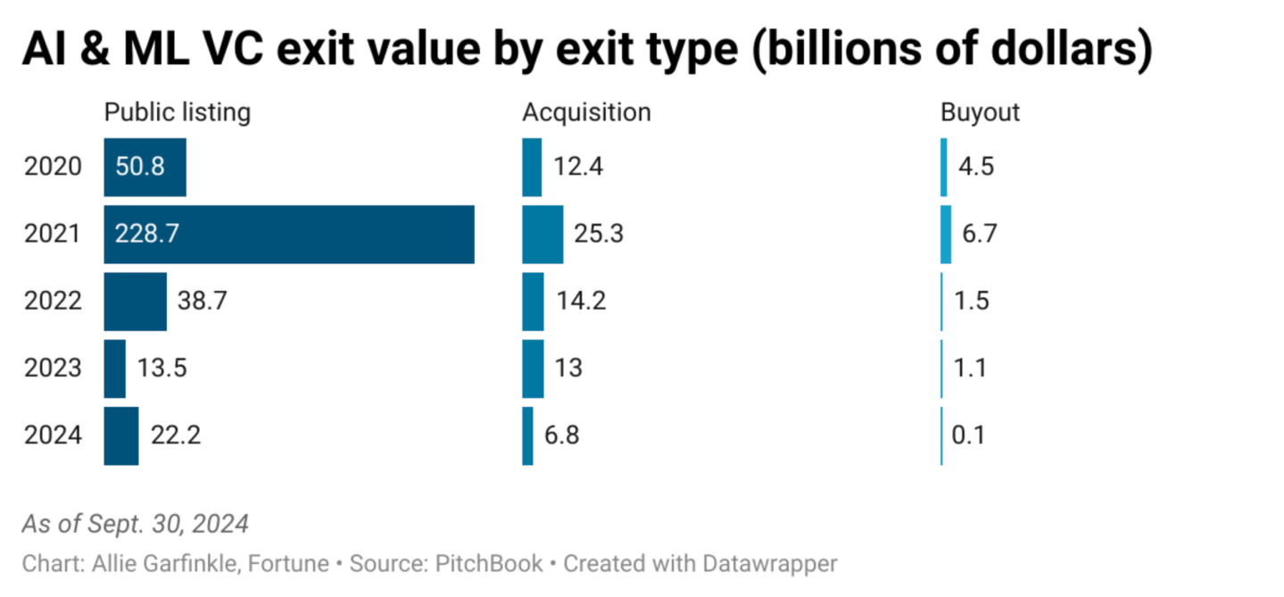 So, sure, buyouts aren’t much of an option, and acquisitions are more sparse for AI companies than they have been in recent memory. That leaves, of course, the toughest and most high-reward path for AI companies seeking an exit: an IPO. It’ll be interesting to see how this data shifts next year, should the IPO window blast wide open again as so many hope and expect.