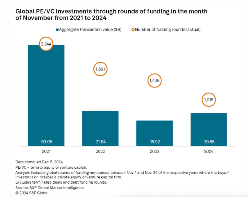 An S&P Global Market Intelligence report finds that global deals with private equity or venture capital firm involvement declined 29.2% year over year to 1,018 in November. However, deal value totaled $20.55 billion, up 29.1% from $15.92 billion a year ago.