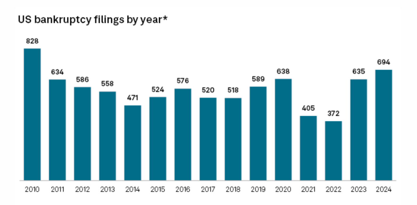 The latest data from S&P Global Market Intelligence finds that December’s 61 U.S. bankruptcy filings by public and private companies brought the 2024 total to 694. This total surpasses the 635 filings in 2023 and the 638 filings in 2020, a previous 10-year high. The 2024 total amounts to the largest single-year tally since 2010, during the aftermath of the Great Recession, according to the report. The largest bankruptcies in December 2024 were announced by Party City Holdco Inc. and China Construction America Inc.
