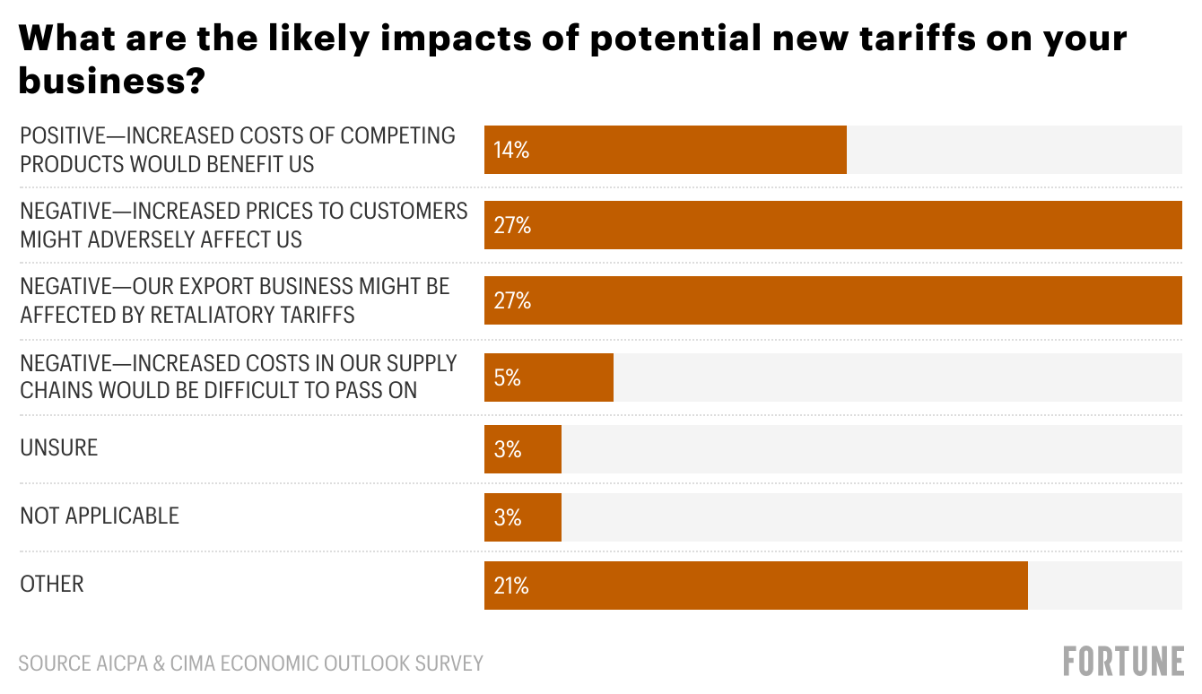 The survey found that 59% percent of respondents think tariffs would have a negative effect on their businesses, and 85% said uncertainty surrounding the subject had influenced their business planning to some degree—18% described that impact as significant. The data is based on a survey of 305 CPAs and chartered global management accountants of which the majority are CFOs at private and public companies. The survey ended on Feb. 26.