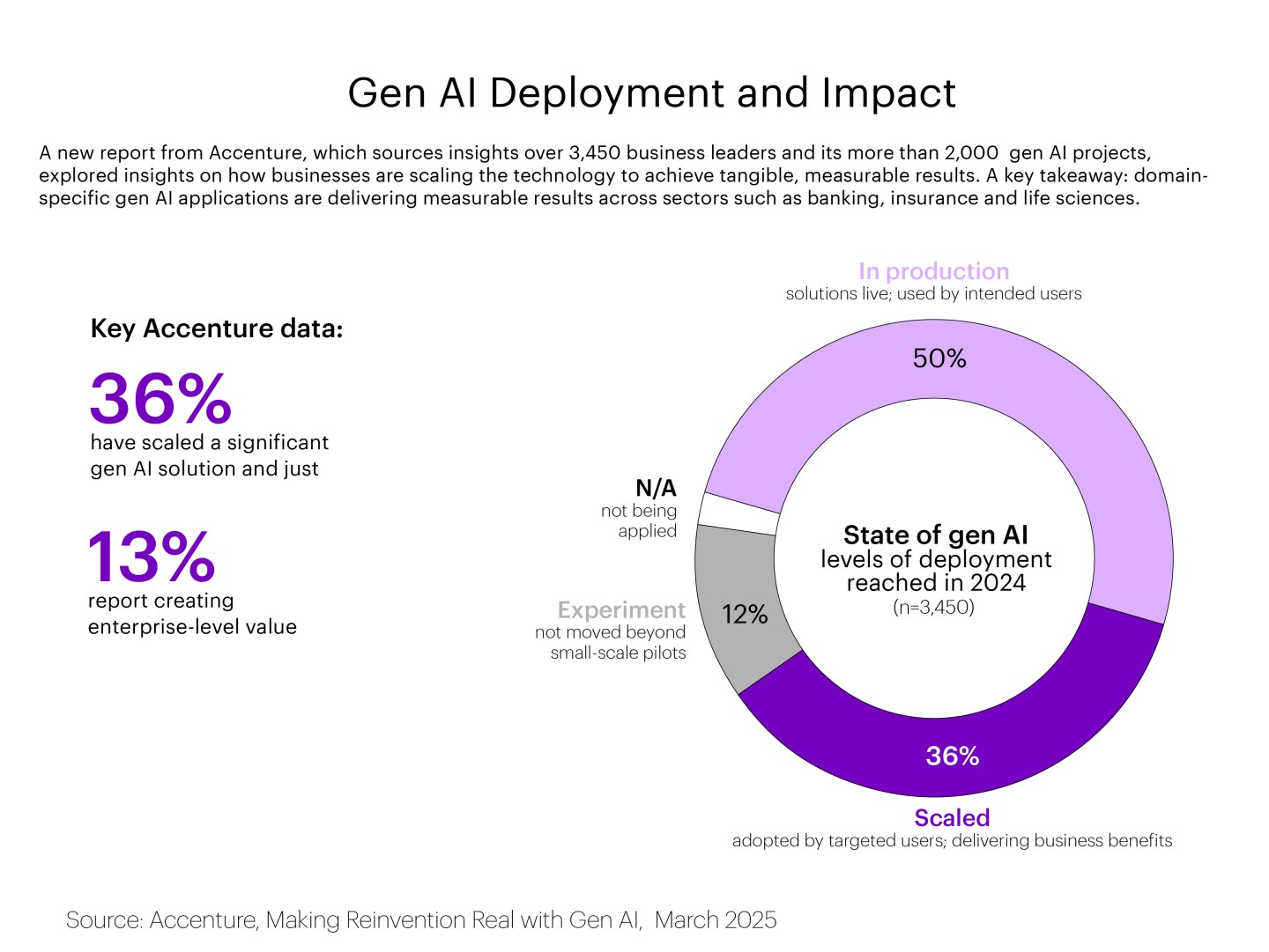 But many are still struggling with deployment. The research analyzed more than 2,000 generative AI projects by Accenture’s clients and found that only 36% of executives say they’ve significantly expanded them. And a mere 13% say the projects have created “significant enterprise-level value.”