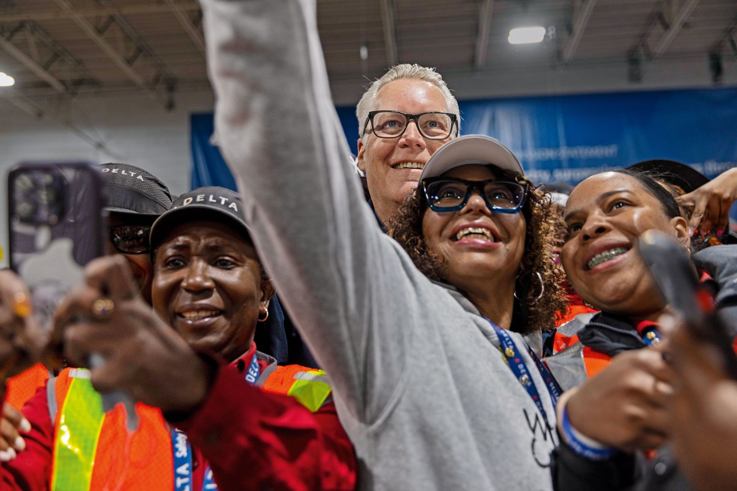 Delta always dispenses bonus checks on Valentine’s Day, and the partying rages all day at warehouses and break rooms from LaGuardia to LAX. At this year’s bash in Atlanta, Bastian was toastmaster. At a five-story customer call center, balloons filled the air, and money guns carpeted the floors with fake bills. The revelers, phones held high, formed two lines, and Bastian marched down the middle slapping two-handed high fives. “Now that we’re 100, let’s party!” bellowed the boss, who posed one-on-one with agents who’d just gotten checks for $5,000 or more.