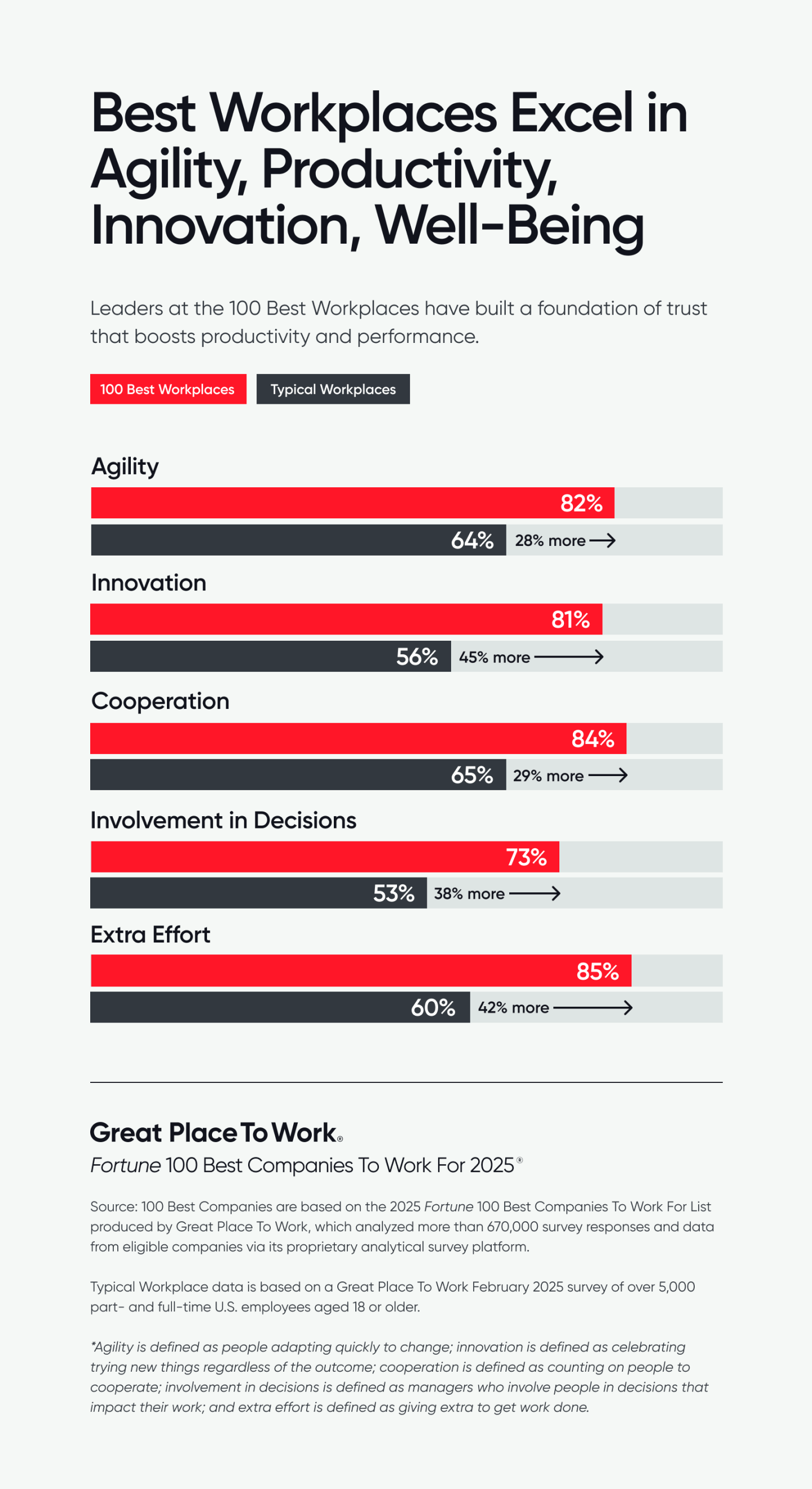 The 100 Best Companies have built a foundation of employee trust that fuels performance in all areas of their business—not just some areas, and not just for some people. They are more profitable and productive because they’ve created consistently positive work experiences, lower burnout rates, and higher levels of psychological and emotional health compared to typical workplaces.