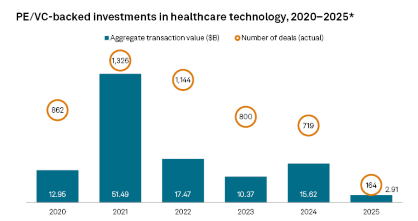 S&P Global Market Intelligence research finds that the value of private equity and venture capital deals in healthcare technology increased to $15.62 billion in 2024 compared to $10.37 billion in 2023. In Q1, 2025, the total deal value in healthcare technology reached $2.91 billion, up almost 22% from the same period in 2024, according to the report.