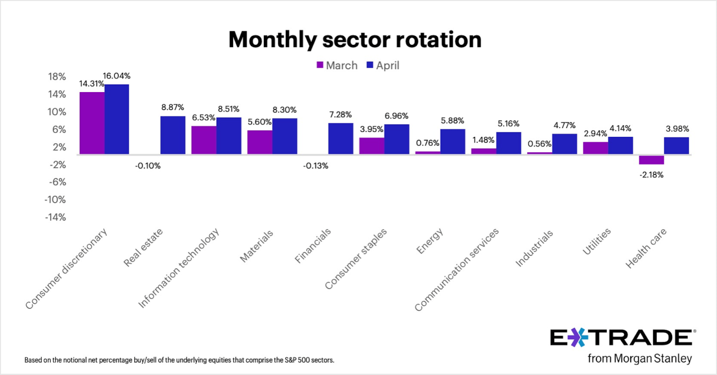 E*TRADE from Morgan Stanley’s monthly analysis finds the three most-bought sectors on the platform in April were consumer discretionary (+16.04%), real estate (+8.87%), and information technology (+8.51%). The data is based on the net percentage buy/sell behavior of stocks on the platform that comprise the S&P 500 sectors.