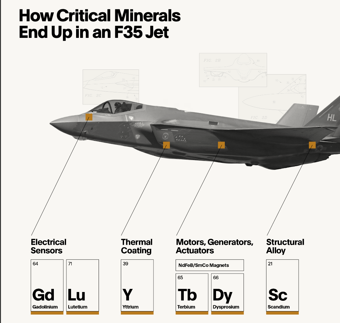 “It’s the biggest gun they have to our heads,” says Evan Smith, CEO of Altana Technologies, which provides supply chain insights to a host of major companies. In the case of the F-35, the company recently created the following graphic, which shows how the planes rely on rare earths for everything from sensors to motors to thermal coating:
