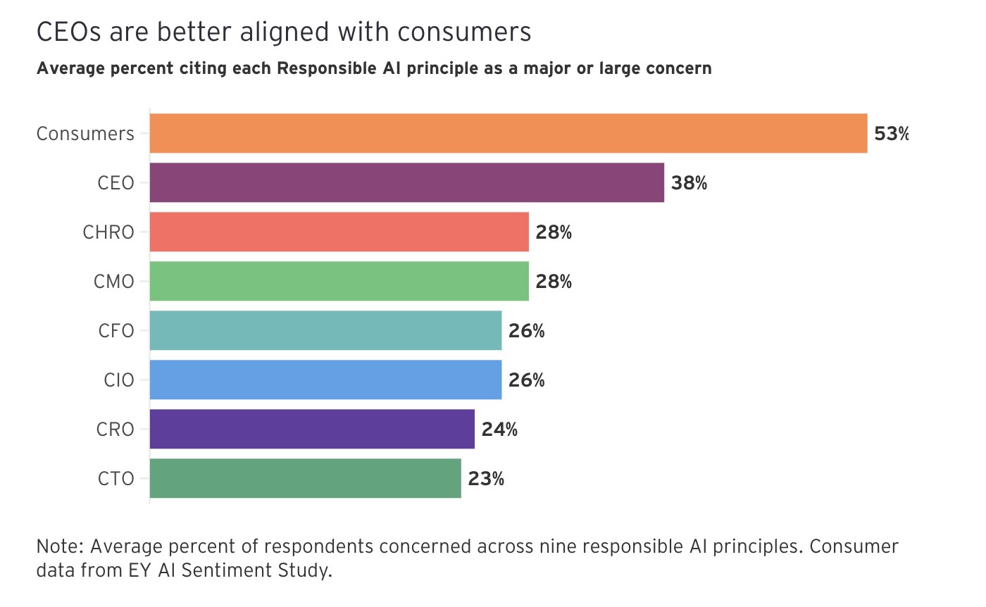 CEOs are more aware of responsible AI concerns than CIOs and CTOs. Consumers are far more likely to express concerns about the accuracy, privacy, explainability, and accountability of AI than any of the seven C-suite leadership roles surveyed by consulting giant EY. For consumers, the average percent of respondent concern across nine responsible AI principles was 53%, versus 38% for CEOs. CIOs were ranked fifth out of the seven C-suite roles (26%) and CTOs were last (23%).