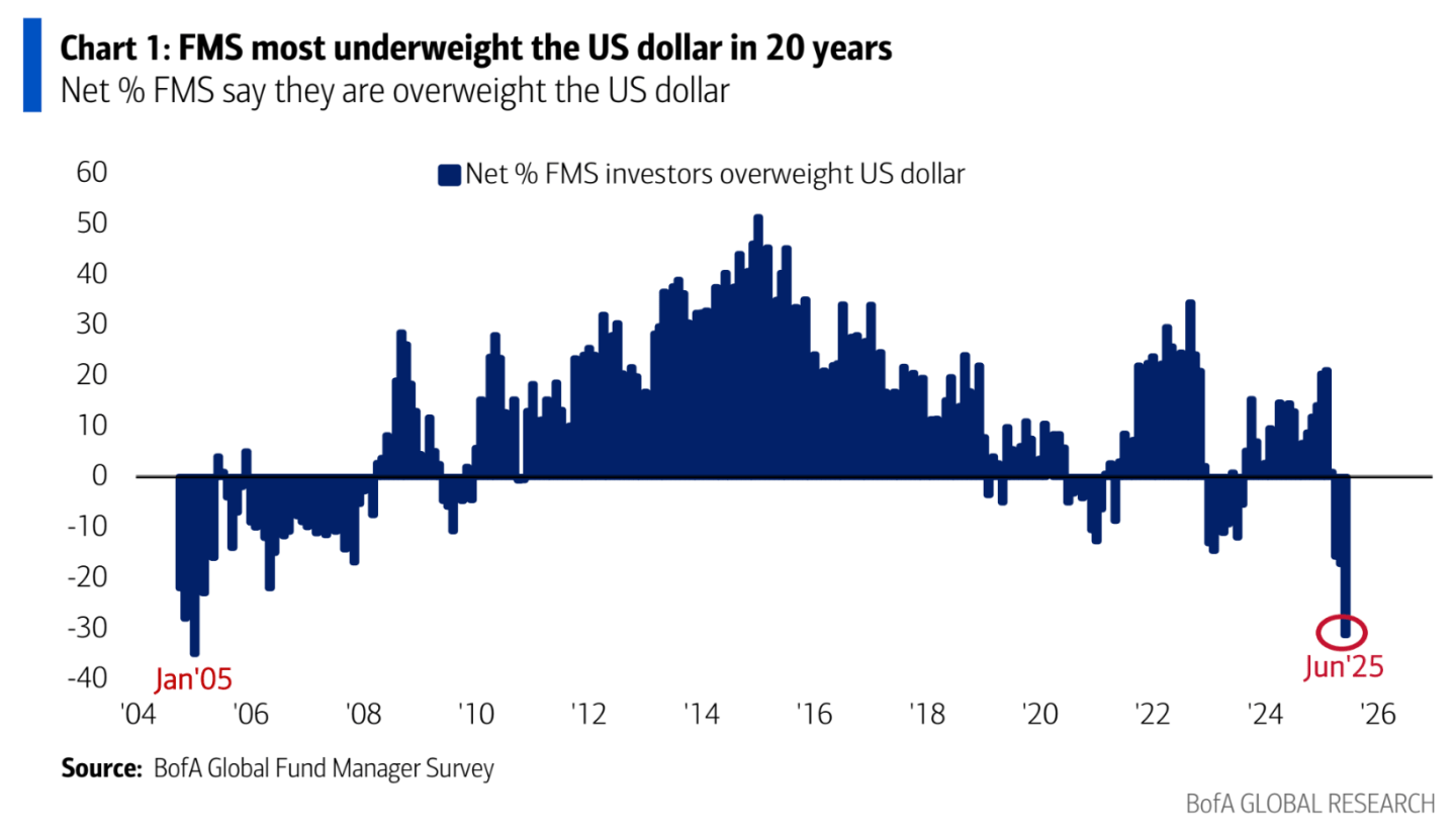 Nonetheless, there’s still one asset that investors hate right now, and that’s the U.S. dollar. The dollar has lost nearly 10% of its value against foreign currencies this year, according to the DXY index. Investors are now the most underweight in the dollar in 20 years, according to BofA. “[The] biggest summer pain trade is long the buck,” Hartnett et al. said.