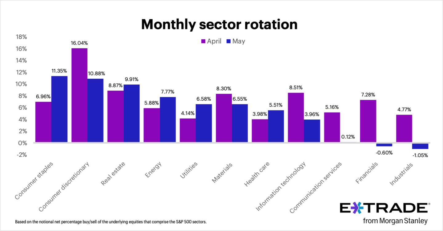 E*TRADE from Morgan Stanley’s monthly analysis finds the three most-bought sectors on the platform in May were consumer staples (+11.35%), consumer discretionary (+10.88 %), and real estate (+9.91 %). The data is based on the net percentage buy/sell behavior of stocks on the platform that comprise the S&P 500 sectors.