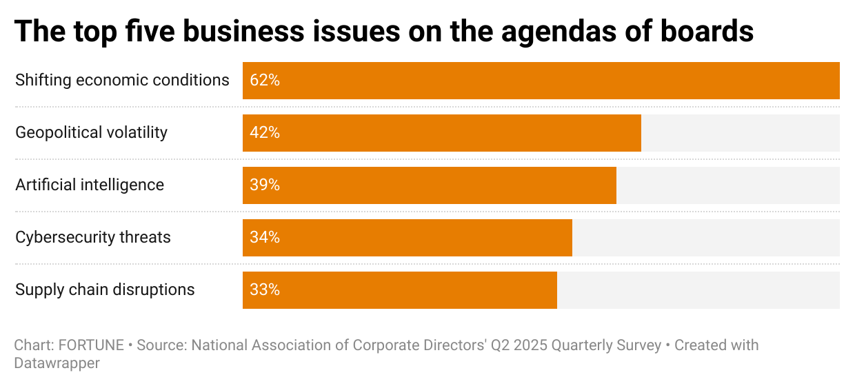 The National Association of Corporate Directors (NACD)’s Q2 2025 Quarterly Survey found that 62% of directors cite shifting economic conditions as the top business issue for boards. Also, in the findings from the 305 directors surveyed, AI now outranks cybersecurity, supply chains, and even talent competition in terms of business issues.