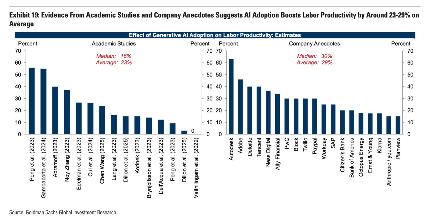 Goldman says AI’s influence on productivity where it’s already been deployed is pronounced. Hatzius’ team cited academic studies and company anecdotes indicating generative AI adoption delivers, on average, a 23%–29% boost to labor productivity. The estimates vary, with academic studies generating a median of 16% and average of 23%, while company anecdotes produce a median of 30% and average of 29%. Still, this suggests tangible efficiency improvements for early adopters.