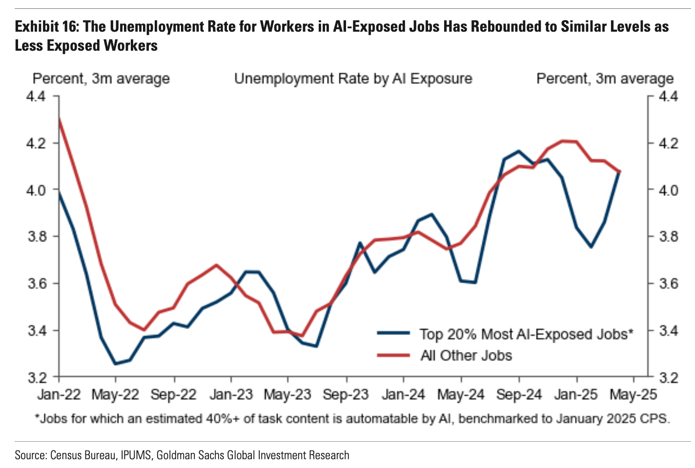 Specifically, Goldman says key metrics such as job growth, wage gains, unemployment rates, and layoff rates in AI-exposed industries have shown little statistically significant deviation from less exposed sectors. AI-related job postings now account for 24% of all IT openings, but still represent just 1.5% of total job postings, indicating that while technology roles are adapting, the broader workforce shift is gradual.
