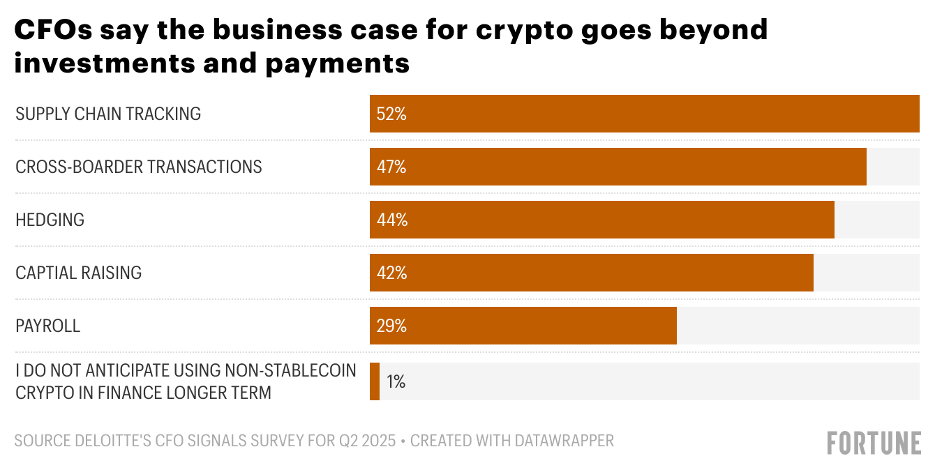 Deloitte released new data this morning from its Q2 2025 CFO Signals Spotlight, which gauges how finance chiefs envision incorporating digital currencies into their operations (CFO Daily received an early look). Only 1% of CFOs surveyed said they do not expect to use crypto for business functions in the long term. Twenty-three percent expect their treasury departments to use crypto for investments or payments within the next two years—a figure that rises to nearly 40% among finance chiefs at companies with revenues of $10 billion or more.