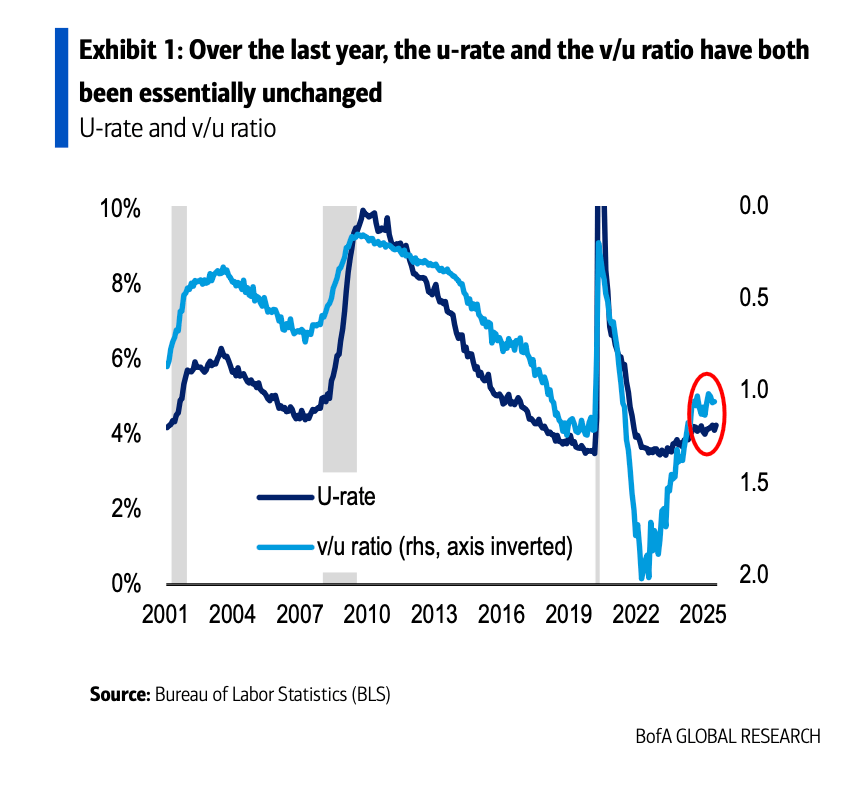 The key distinction comes down to labor supply, not just demand. The research points to a sharp contraction in the foreign-born labor force—down by 802,000 since April—as immigration policy has tightened dramatically. This supply-side squeeze is pushing against weaker labor demand, keeping metrics that should indicate labor slack—such as the unemployment rate and the ratio of job vacancies to unemployed workers—basically flat for the past year. Bank of America estimates that break-even job growth, meaning the rate of hiring needed to keep joblessness steady, will hit just 70,000 per month this year.
