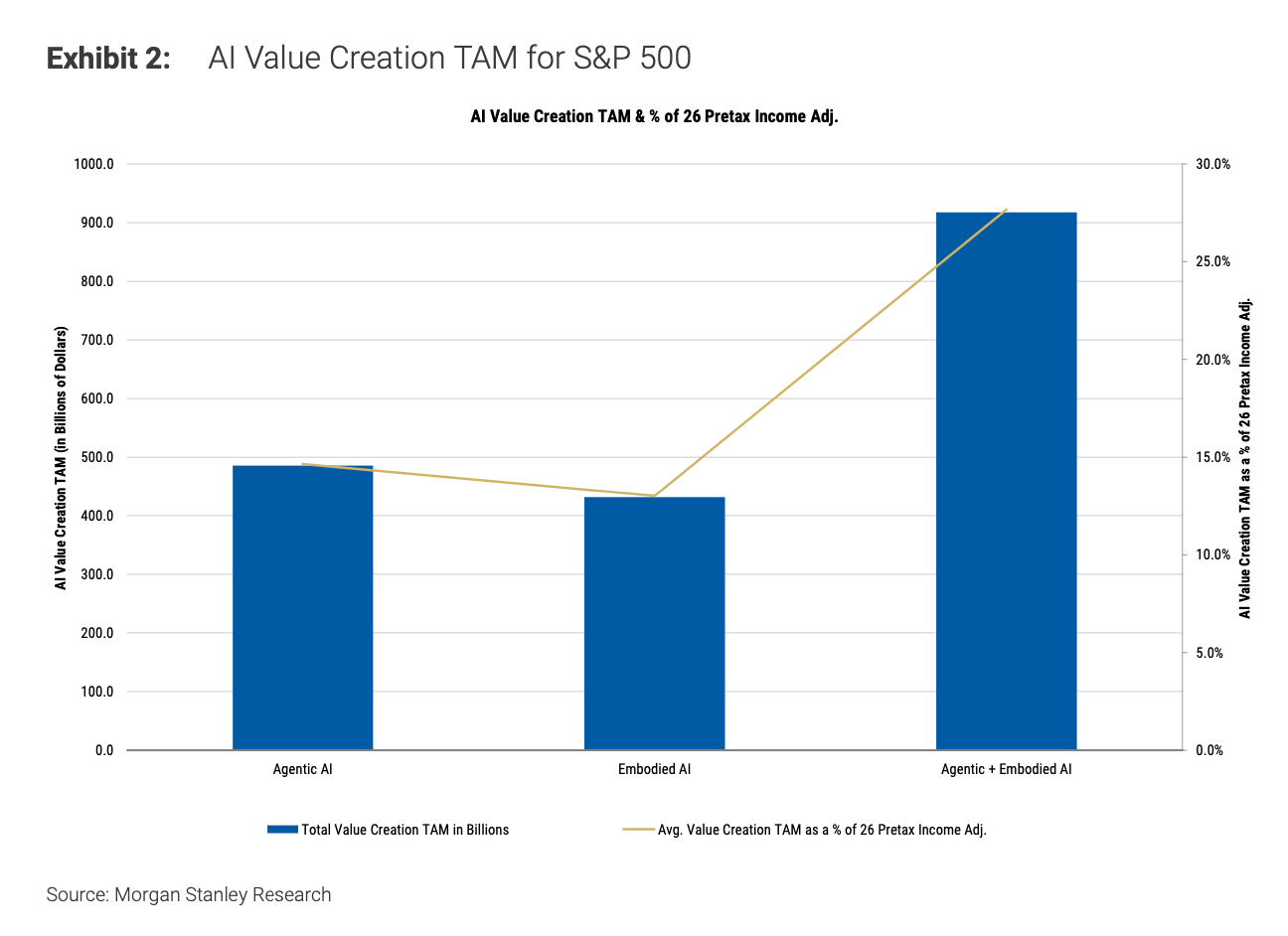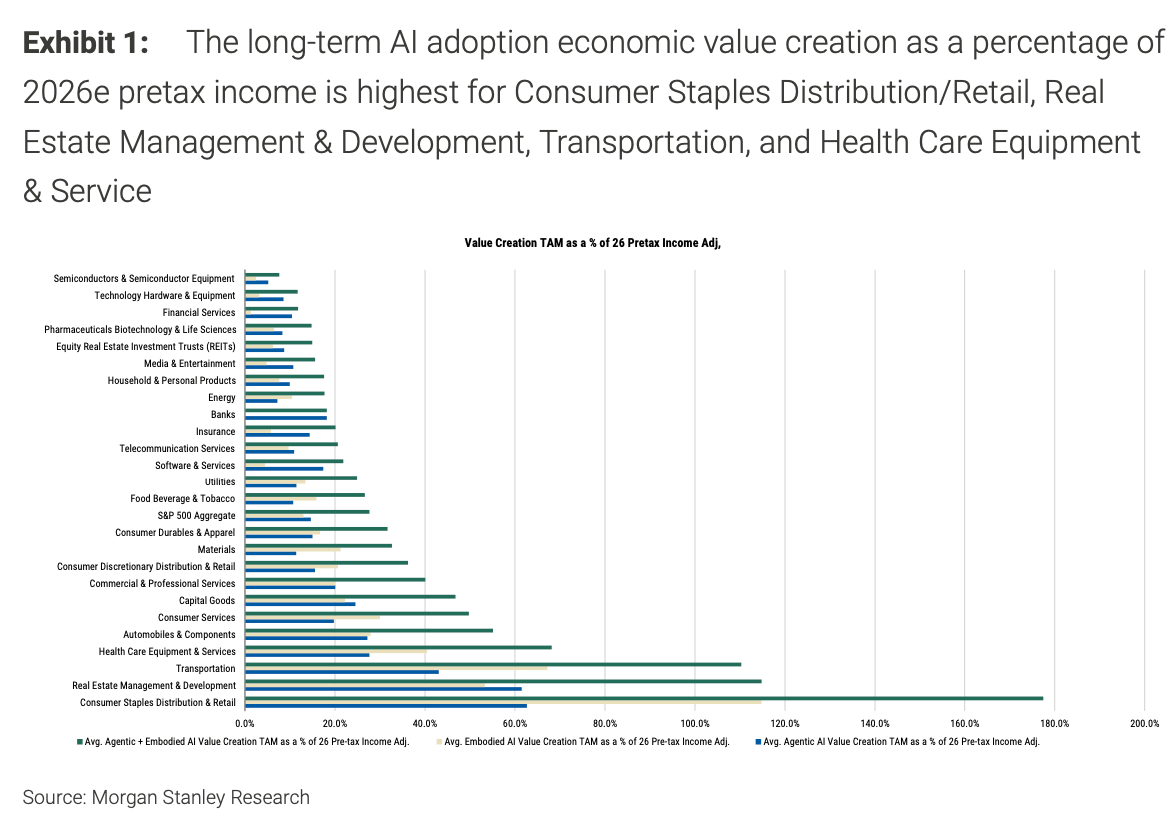 Though the top-line savings will come from payroll reductions, Morgan Stanley stressed the distinction between full automation and task-level augmentation. Agentic AI, which spans generative AI and software applications, tends to reassign tasks rather than eliminate jobs outright, while embodied AI in the form of humanoid robots poses more direct substitution risks in industries such as logistics and physical retail.