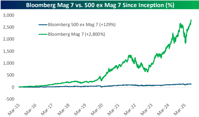 And here is a chart from Bespoke Investment Group. It shows the performance since 2015 of the Magnificent Seven companies vs. the rest of the market. “Bloomberg’s Mag 7 index vs. its 500 Ex Mag 7 index is pretty unbelievable. You can barely see the ‘Ex Mag 7’s’ 129% gain because of how much the 2,800% gain for the Mag 7 overshadows it,” the company says: