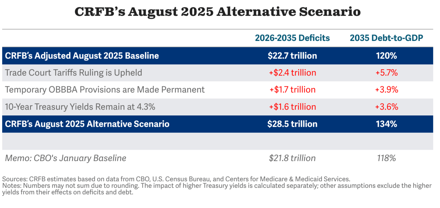 “The nation’s finances have deteriorated” since President Trump took office, driven by sweeping legislative and trade policy changes, according to the Committee for a Responsible Federal Budget (CRFB). The nonpartisan watchdog noted that the Congressional Budget Office’s January 2025 budget outlook “already showed a worrisome fiscal outlook,” but developments since mean a widening deficit. The CRFB gamed out several scenarios, including an adjusted baseline which accounts for “most legislative and administrative changes but not economic and technical changes.” The CRFB also included an alternative scenario in which the U.S. Trade Court’s ruling that many of Trump’s tariffs are illegal is upheld; temporary provisions of the One Big Beautiful Bill Act are made permanent; and yields on Treasury securities remain at their current level.