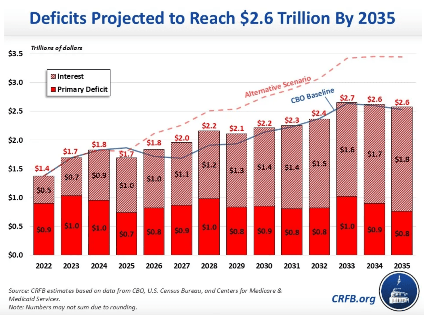 Under the alternative scenario, annual deficit growth would be exacerbated by extensions of tax cuts and spending increases, combined with higher interest on the rapidly rising debt load. Also under this scenario, interest payments on the national debt, already surging from less than $500 billion in 2022, could hit $2.2 trillion (5.1% of GDP) annually by 2035 if interest rates stay high. The CRFB warns the outlook could be even worse if offsets built into OBBBA are delayed and new deficit-increasing proposals—like tariff rebates—are implemented, or if economic headwinds slow revenue collection. A recession or financial crisis over the next decade could further deepen deficits and add to the debt burden.