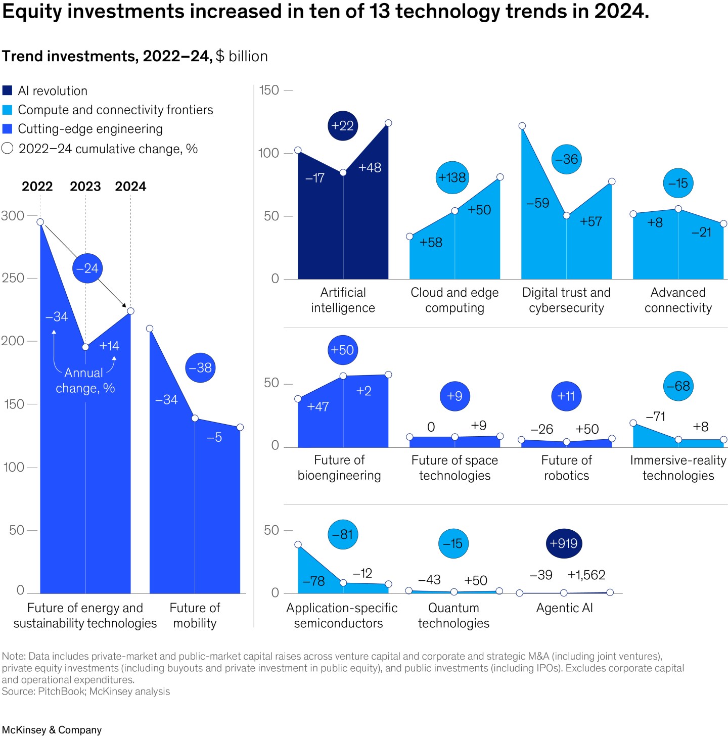 Generative AI giving an innovation lift to other tech advancements. McKinsey has identified 13 technology trends that the consulting giant says has the potential to transform business and reported that equity investments have increased in 10 of these breakthroughs, with big double-digit gains for AI, cloud and edge computing, and digital trust and cybersecurity. Agentic AI, an application of generative AI that can perform more complex tasks and at times act autonomously, experienced a particular meteoric rise, with $1.1 billion in equity investments last year and a 985% increase in job postings from 2023.