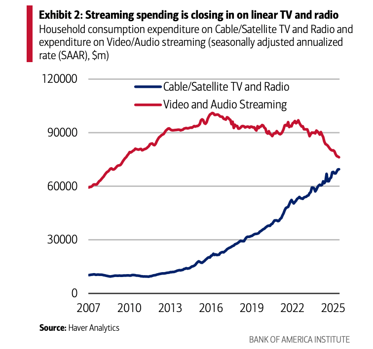Americans are watching more television than ever, but the screen they turn to increasingly isn’t wired for cable. According to Bank of America Institute, streaming platforms officially overtook traditional “linear” television in viewership share this spring, marking a historic shift in how people spend their downtime. It’s almost as large as linear TV and radio combined.
