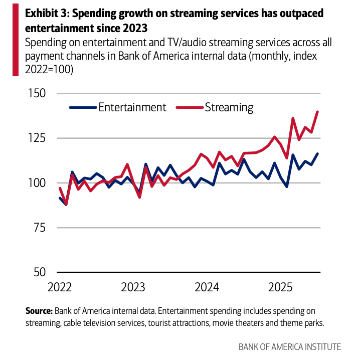 BofA’s internal card-spending data shows two-thirds of households are still paying less than $40 a month for streaming. But the bills are creeping up: Roughly one in six households now spends more than $80 per month, and nearly 10% are shelling out over $100.