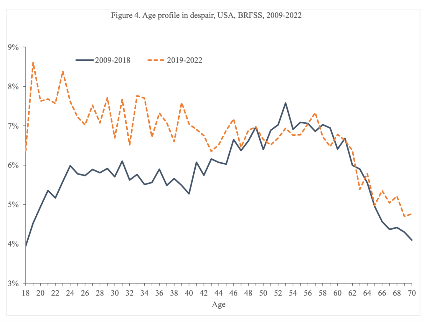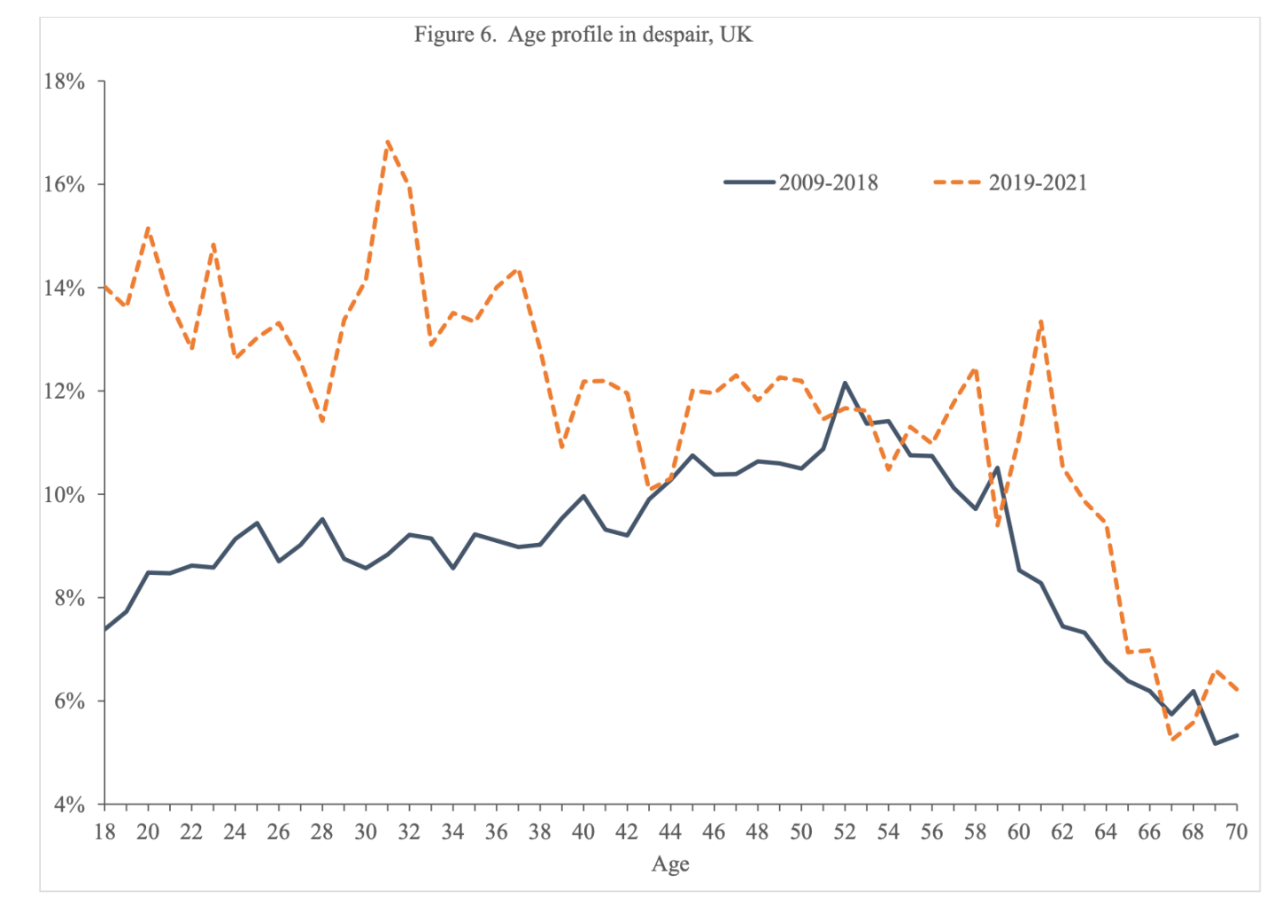 “The reason that mental despair now declines in age is because of the recent decline in the mental health of workers under the age of 40 and especially those under 25,” they write. The rise is seen across different datasets and demographic groups, but is especially pronounced among women and those with jobs, rather than unemployed or economically inactive individuals.