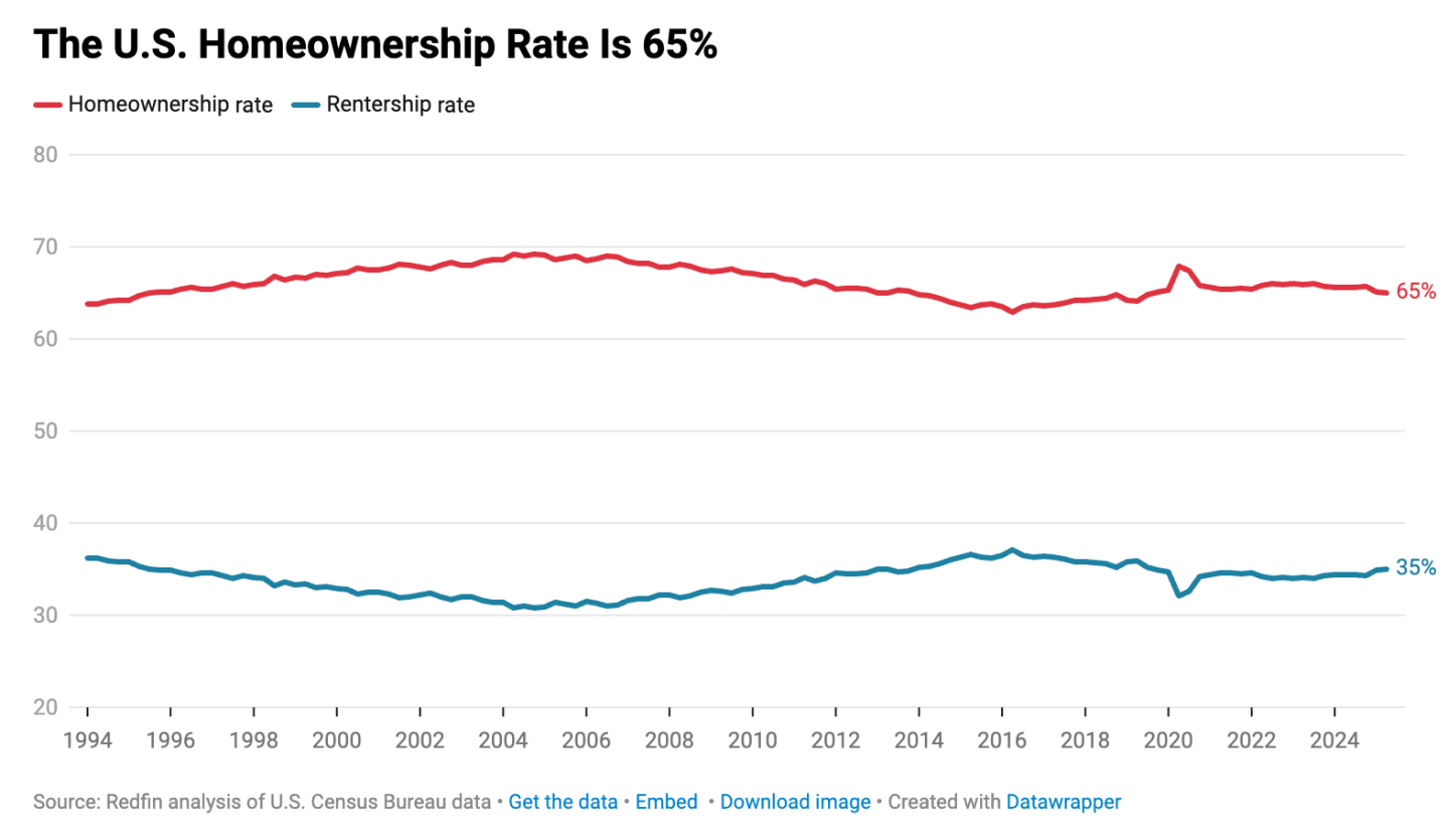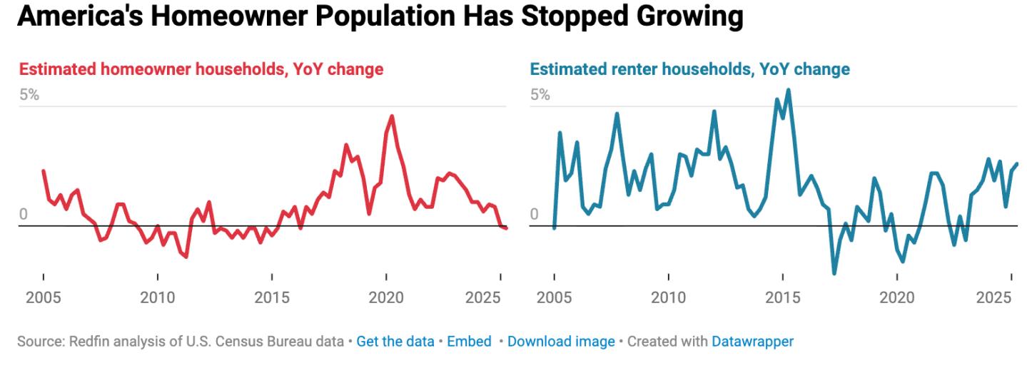 For the first time since 2016, America’s homeownership rate has tipped into negative territory, signaling a subtle but profound shift in the nation’s housing dynamics, Redfin reports in its new analysis of U.S. Census Bureau data. In the second quarter of 2025, the number of U.S. homeowner households fell ever so slightly, by 0.1% year over year to 86.2 million, while renter households surged by 2.6% to 46.4 million—one of the largest increases in recent memory. It shows the inevitable result of the long flatline in the housing market as mortgage rates more than doubled between January 2021 and October 2023.