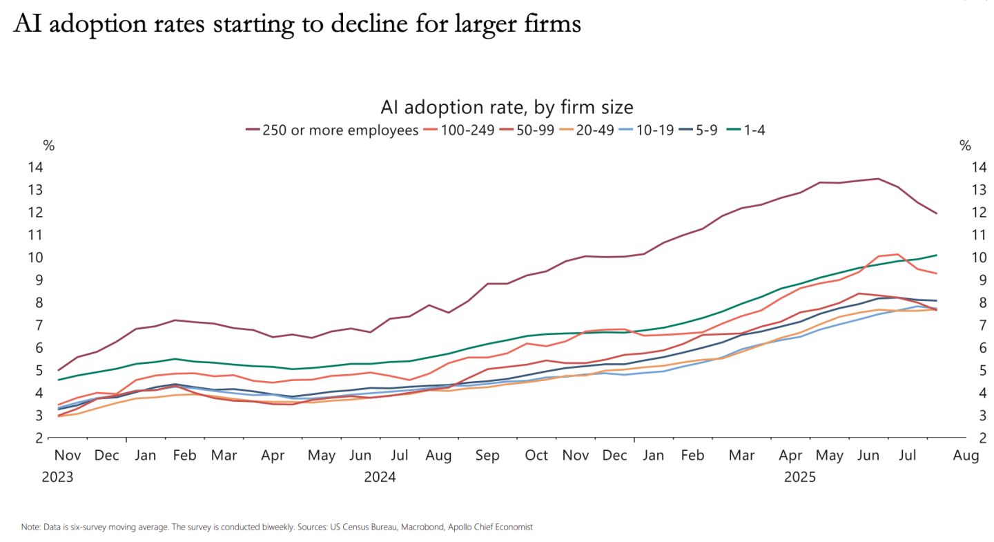 Apollo Global Managementchief economist Torsten Slok notes that one question in the survey is whether a business has used AI tools such as machine learning, natural language processing, virtual agents, or voice recognition to help produce goods or services in the past two weeks. “The bottom line is that the biweekly Census data is starting to show a slowdown in AI adoption for large companies,” Slok wrote in his Daily Spark newsletter on September 7.